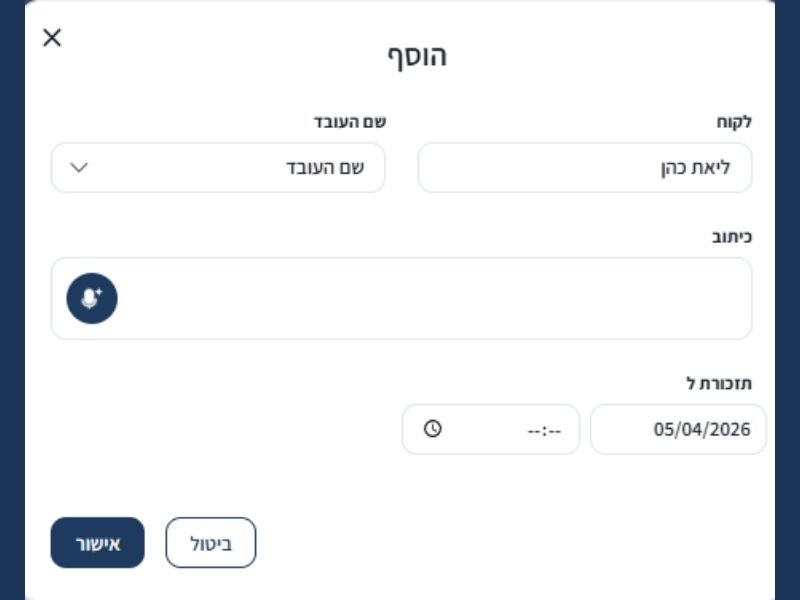 עם תפעולית, כל אינטראקציה עם הלקוח מתועדת, נגישה ומנוהלת בצורה חכמה, כך שתוכלו להתמקד במה שבאמת חשוב – טיפול מקצועי וצמיחת העסק.
