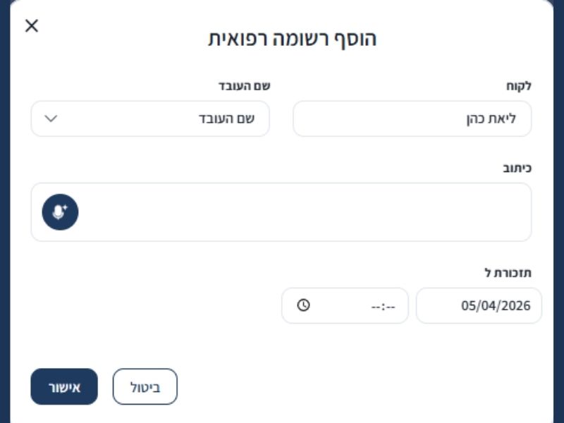 כן. ניתן לתעד כל טיפול, כולל פרטים מקצועיים, הערות ורשומה רפואית, כדי לשמור על עבודה מסודרת ובטוחה.